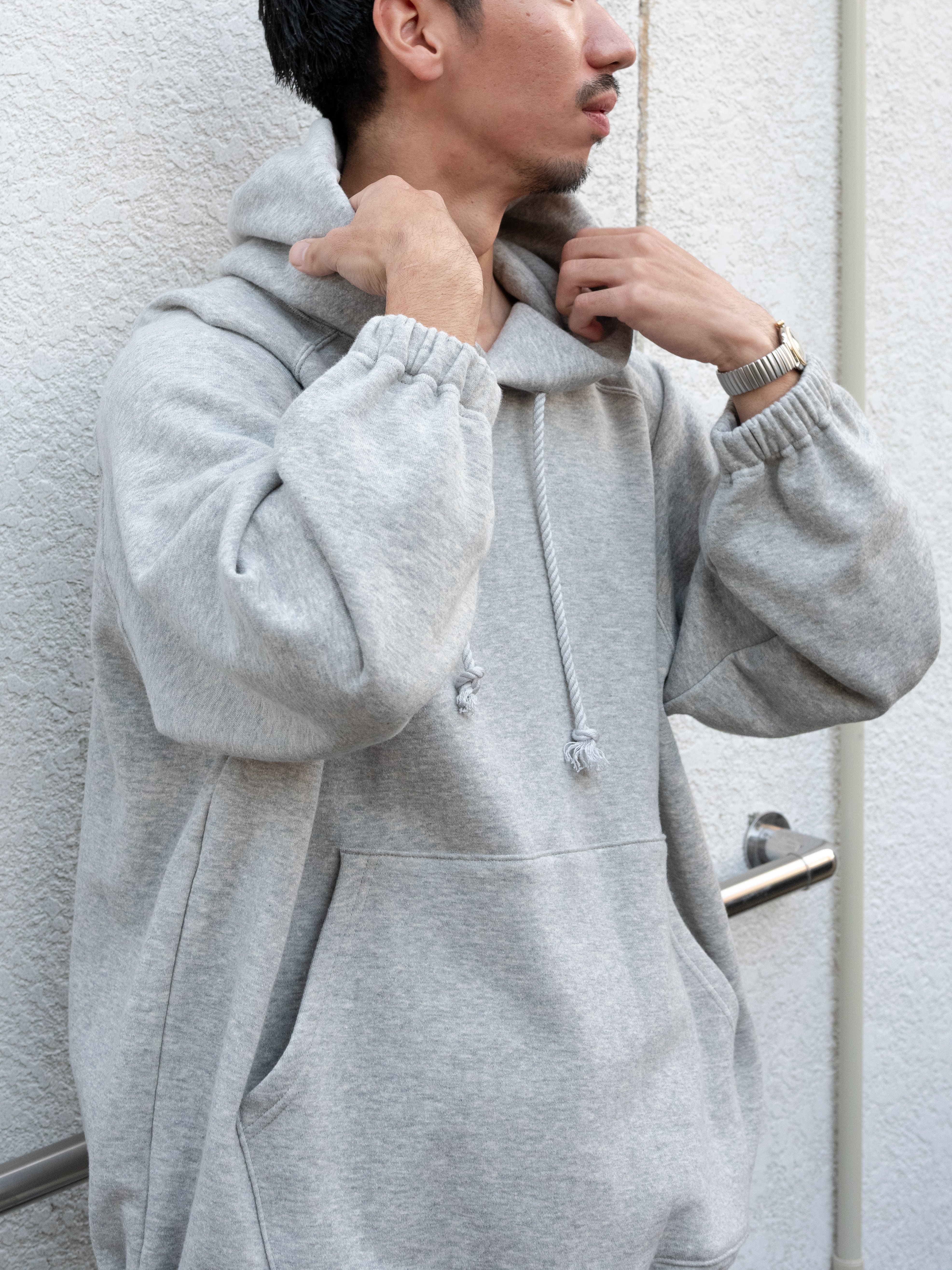 リブを排除したイージーパーカーはスウェットはもちろん布帛でも従来のフーディーのようにラフ過ぎないスタイルに。