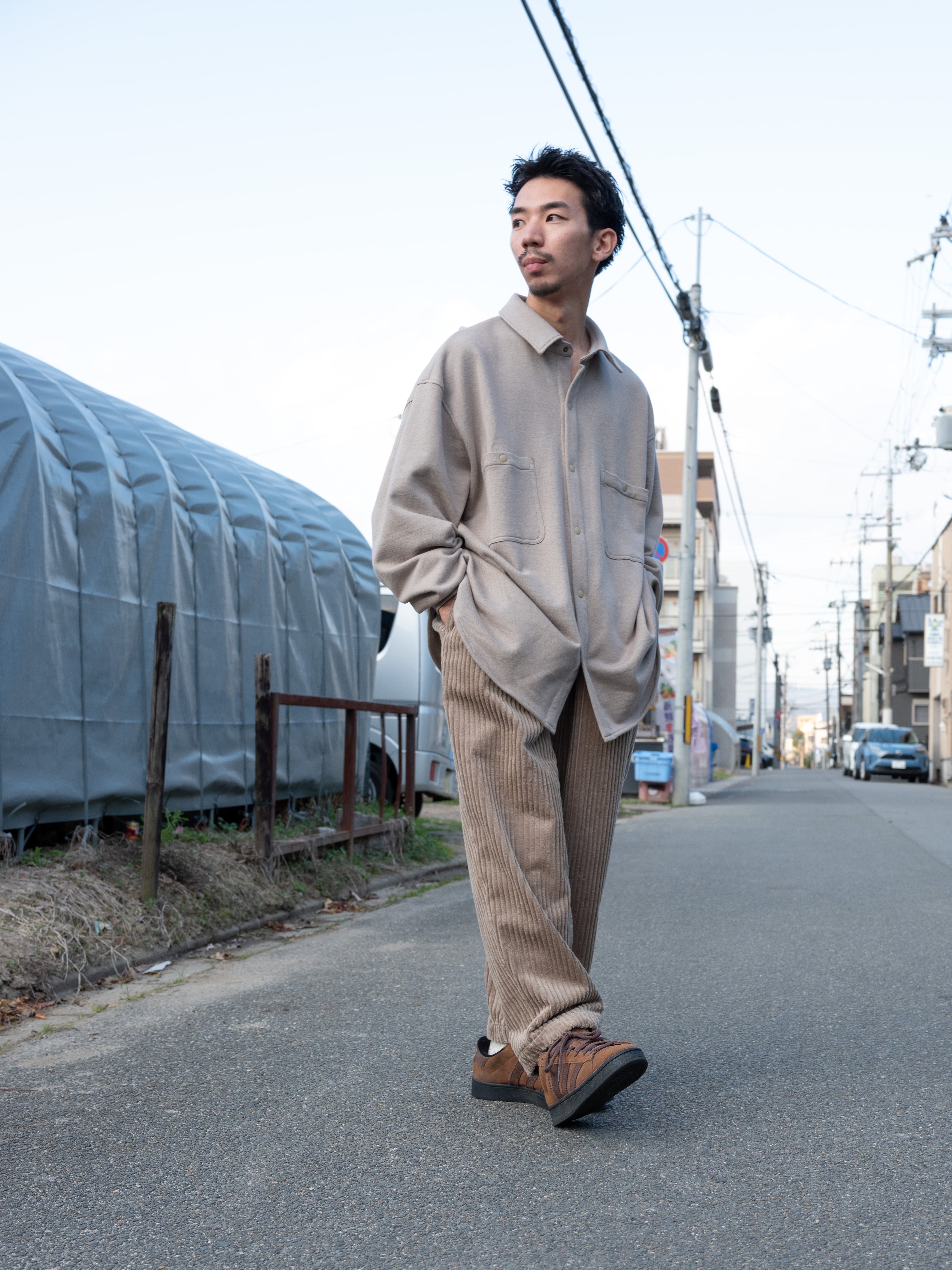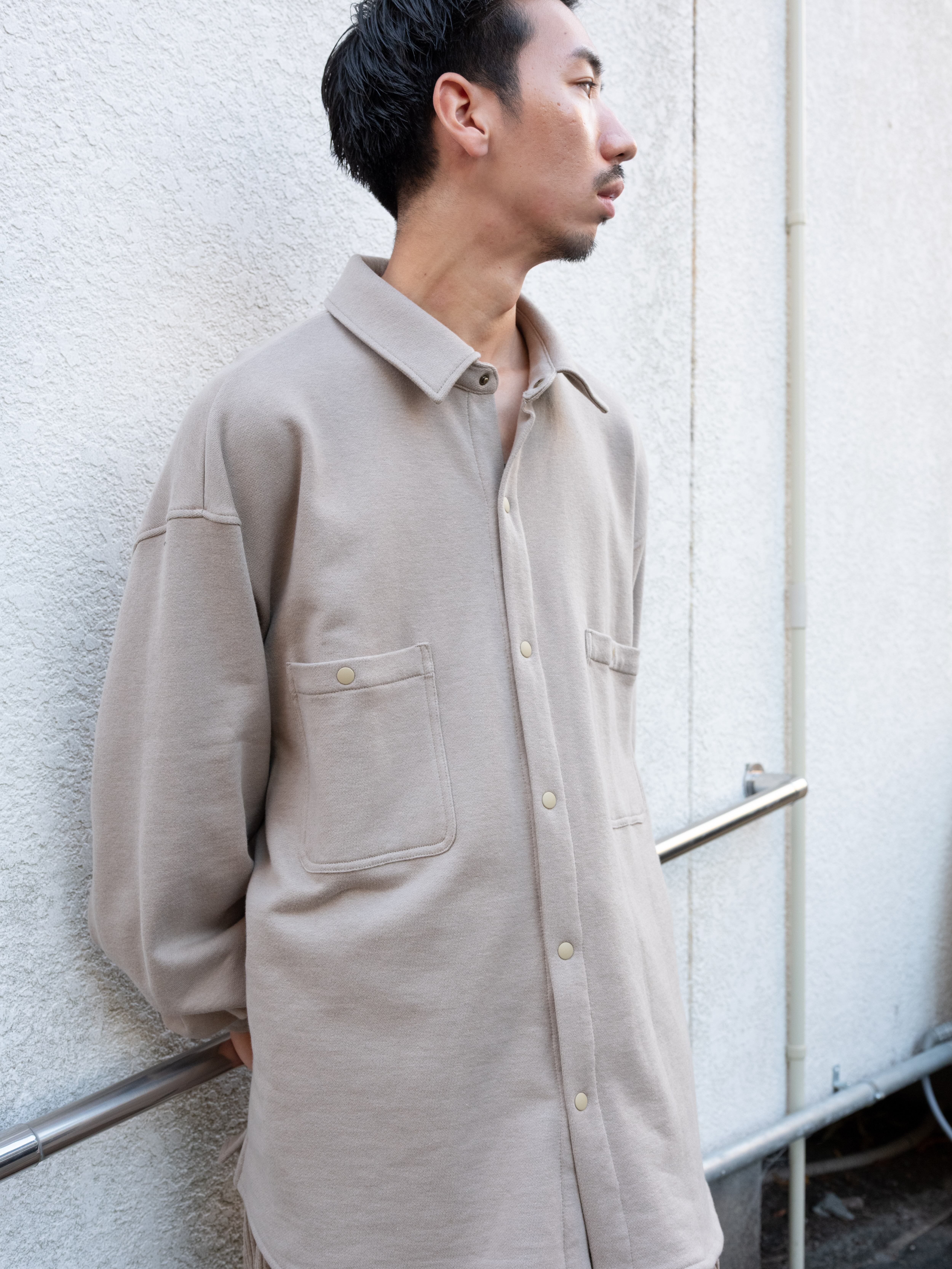 全体的にゆったりとしたアウトドアライクなオーバーサイズシルエットで、両胸に大きなポケットを配置し袖口のギャザーや後身頃のサイドプリーツなど人間の可動域を確保したゆったりとしたパターンワークで動きやすい作りに。素材もしなやかな裏毛スウェットで快適な着心地を実現しています。